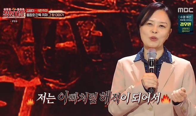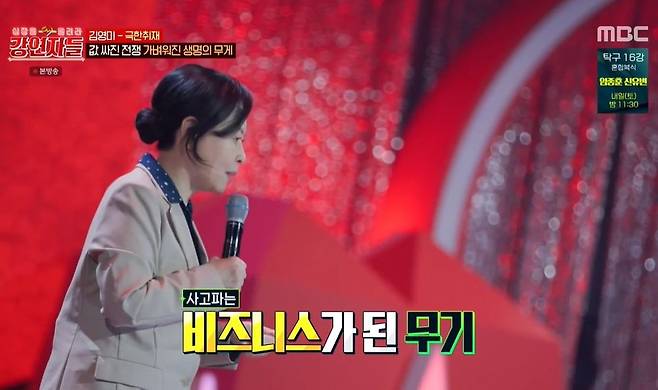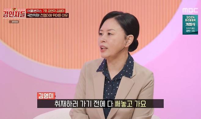 이날 분쟁지역 전문 PD 김영미는 '왜 위험한 곳을 가느냐, 언제 죽을지 모르는데 왜 가느냐'란 질문을 많이 받는다고 밝혔다. 김영미는 "아무도 안 가기 때문에 제가 갈 수밖에 없다. 제가 가는 세계는 전쟁, 기아, 자연재해, 내전까지 피바람 부는 현장이다. 그 현장은 우리하고 굉장히 멀리 떨어져 있죠? 그래서 저 같은 사람들이 가서 그 정보를 배달해 오는 거다. 국제뉴스는 많은 이해관계가 얽혀 있는데, 이를 쉽고 이해하기 편하게 전달하는 역할을 하고 있다"라고 밝혔다.