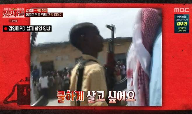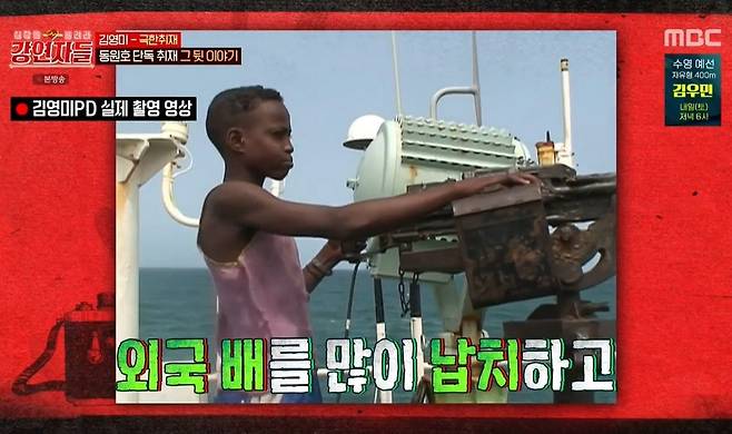 김영미는 "그런데 소말리아 가서 본 모습은 처참했다. 그냥 아무것도 없었다. 먹을 게 없으니까 우리끼리도 치사해지더라. 굶어 죽느니 해적이라도 해서 먹고 살려고 했던 거다. 해적 마을 어떤 아이에게 미래에 뭐가 되고 싶냐고 물어보니까 아빠처럼 해적이 돼서 외국 배를 많이 납치하고 싶다고 하더라"라며 "원칙적으로 해적은 범죄다. 범죄가 재발하지 않게 하려면 가난, 기아에 대해 근본적인 치료가 되어야 한다. 제가 살았던 세상에만 해적이 있었으면 좋겠다"라고 소신을 밝혔다.