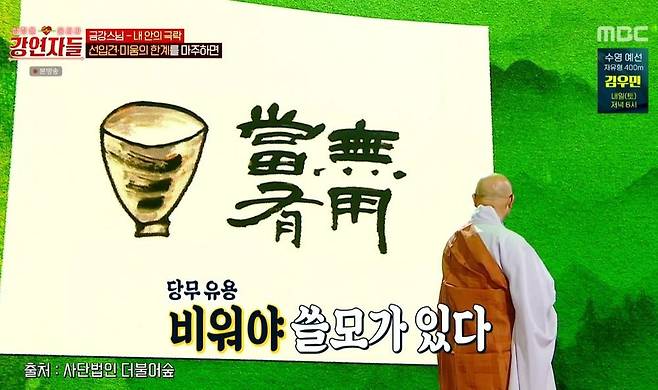 마지막으로 금강스님은 당무유용에 대해 "비워야 쓸모가 있다. 나를 늘 비워야 한다. 어제 있던 일까지 비워야 한다. 그래야 오늘을 만날 수 있다. 마음의 노폐물을 씻어내는 방법은 명상이다"라며 함께 명상하는 시간을 가졌다.