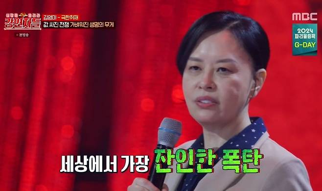 김영미는 최근 우크라이나 전쟁을 취재했다고. 김영미는 "공습경보가 하루에도 몇 번씩 울렸고, 탄도 미사일이 날아왔다"라며 긴박했던 당시 상황을 전했다. 바로 100m 앞에서 미사일이 터졌다고. 김영미는 "민간인 대상으로 드론 공격이 자행된 건 2000년대 초부터였다. 아파트까지 들어오진 않았는데, 드론이 점점 성능이 뛰어나졌다"라며 "창문을 열어놓으면 들어와서 터진다. 한국에서도 저도 모르게 커튼을 치고 있더라"라며 트라우마를 고백했다.