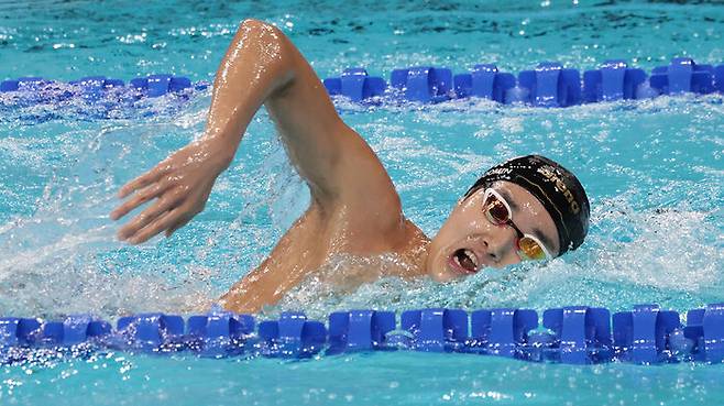 ▲ 25일(현지시간) 프랑스 파리 라데팡스 아레나에서 훈련을 하고 있는 수영 국가대표 김우민