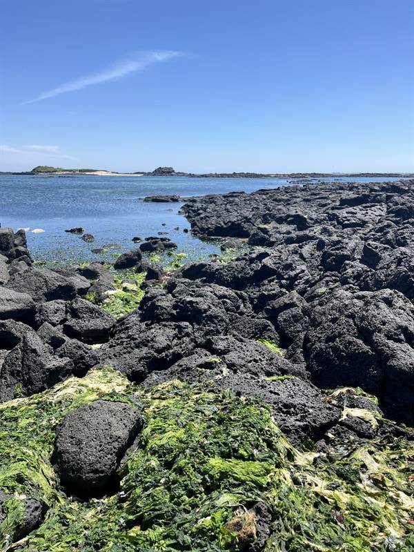 탐사대는 토끼섬 주변해역의 천연잘피 서식 환경을 살펴보기 위해 해안가의 바위지대를 지나 토끼섬과 가장 가까운 곳까지 들어가 보았다. 울퉁불퉁한 바위를 조심스럽게 딛는 곳마다 말라붙은 구멍갈파래가 널려 있었고, 이들이 말라붙고 썩으면서 발생하는 악취가 진동하고 있었다. 이와 같이 해안가에 구멍갈파래가 떠밀려와 쌓이는 현상은 제주에선 흔한 풍경이다. 구멍갈파래 급증과 같은 녹조류 대발생(green tide)은 연안에 생기는 파래류가 과도하게 성장하여 연안의 바위를 뒤덮거나 조류에 떠밀려 해안에 쌓이는 현상이다.