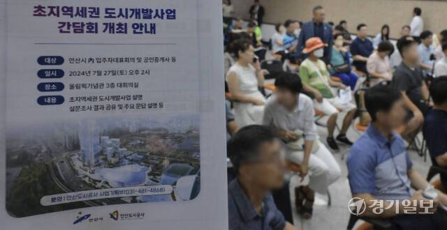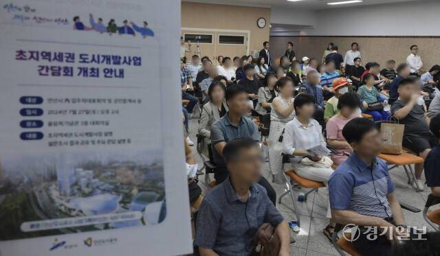 27일 오후 안산시 단원구 안산올림픽기념관에서 열린 '초지역세권 도시개발사업 간담회'에서 안산시민들이 안산도시공사의 개발사업 계획 등을 경청하고 있다.