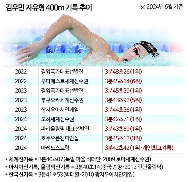 앞서 예선에서 3분45초45, 아슬아슬한 7위 기록으로 간신히 결선에 오른 김우민은 1번 레인에서 예선과 달리 초반부터 빠르게 치고 나갔다. 특유의 '직진 본능'이 유감없이 발휘됐다. 첫 50m를 마르텐스에 이어 2위로 통과했다. 박 위원은 "스타트가 좋다. 예선과 다르다"고 목소리를 높였다. 100m까지 마르텐스가 52초01, 김우민이 52초50까지 2위를 유지했다. 200m를 1분48초71, 250m 2분17초10으로 마르텐스에 이어 2위를 달렸다. 위닝턴에게 막판 역전을 허용하면서 3위로 내려섰지만 포디움을 끝내 지켜냈다. 최종 기록은 3분42초50으로, 개인 최고 기록인 3분42초42와 불과 0.08초 차이밖에 나지 않을 정도로 제능력을 발휘했다.