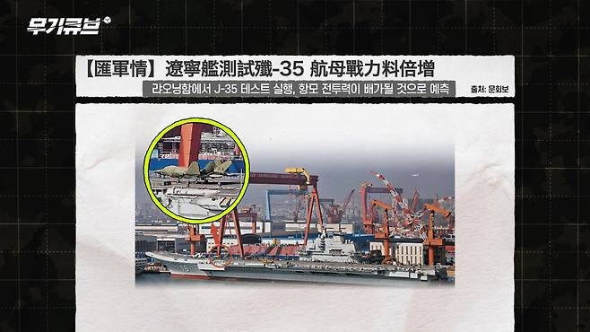중국 다롄 조선소에서 1년 동안 개량을 완료하고 공개된 중국 최초의 항공모함 랴오닝함 비행갑판에 방수천을 둘러싼 J-35가 있다면서 의도적으로 사진을 공개하고 중국의 첫 5세대 스텔스 함재기를 갖춘 항공모함이라고 소개했습니다.