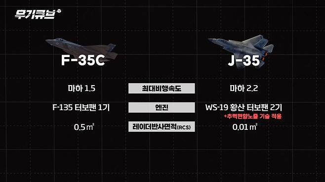 또 F-35C의 최소 레이더 반사 단면적은 0.5㎡인 반면 J-35는 0.01㎡에 불과하다며 자신들의 스텔스성능이 더욱 우수하다고 주장했죠.