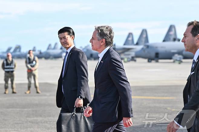 (훗사 로이터=뉴스1) 우동명 기자 = 토니 블링컨 미국 국무장관이 28일(현지시간) 일본을 방문하기 위해 도쿄 훗사에 있는 요코타 공군 기지에 도착을 하고 있다. 2024.07.28