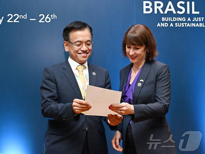 (서울=뉴스1) = G20재무장관회의 및 한-중남미 혁신포럼 참석차 브라질 리우 데 자네이루를 방문 중인 최상목 부총리 겸 기획재정부 장관이 7월 25일(현지시간) 레이첼 리브스 신임 영국 재무장관과 대화를 하고 있다. (기획재정부 제공) 2024.7.26/뉴스1