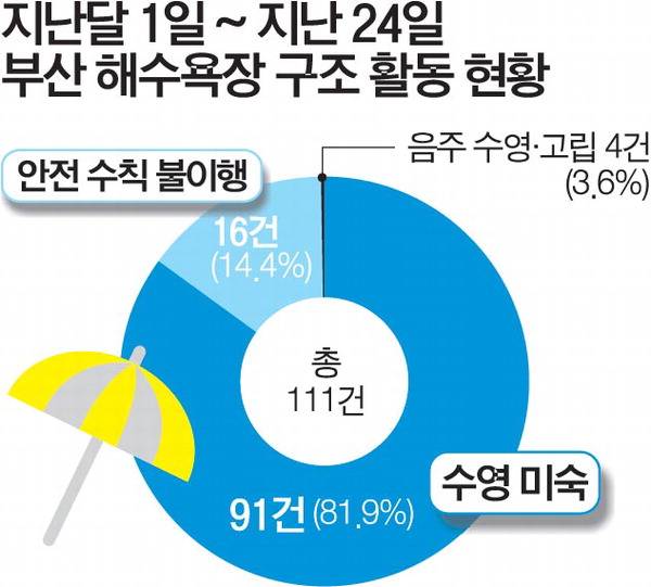 지난달 1일 2개 해수욕장(해운대·송정) 부분 개장 이후 지난 24일까지 부산소방재난본부가 진행한 구조·구급 활동은 414건(구조 111건·구급 303건)이다. 지난해 동기간 241건에 비해 1.7배 증가했다. 해수욕장별로 보면 ▷광안리 142건 ▷송정 85건 ▷송도 73건 ▷해운대 54건 ▷다대포 46건 ▷일광 11건 ▷임랑 3건 순이다. 111건의 구조 활동 유형은 ▷수영 미숙 91건(81.9%) ▷안전 수칙 불이행 16건(14.4%) ▷음주 수영 2건(1.8%) ▷고립 2건(1.8%) 등으로 나타났다.