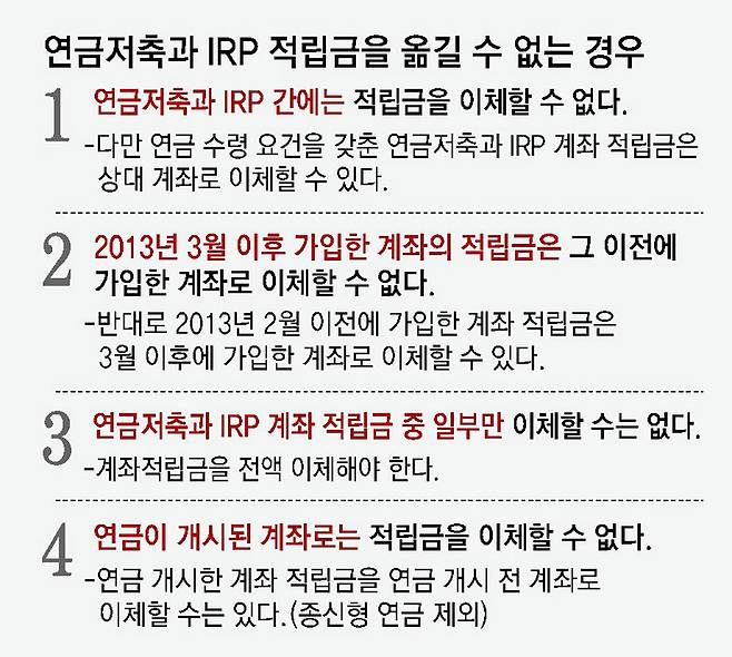 통상적으로 연금저축은 연금저축으로, IRP 적립금은 IRP로 옮겨야 하지만 연금수령 요건을 갖춘 계좌의 적립금의 경우 상대 계좌로 이체할 수 있다.