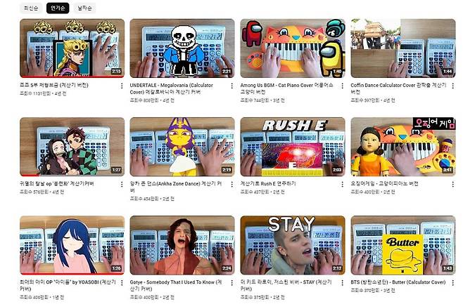 방탄소년단 ‘버터’, 게임 ‘어몽 어스’ BGM, 브레이브걸스 ‘롤린’, 애니메이션 ‘진격의 거인’ 오프닝, 제로투 댄스, 게임 ‘동물의 숲’의 캐릭터 송 ‘나비보벳따우’ 계산기 버전 등이 대표적인 커버 곡들이다. 이들은 평균 조회수 500만 회를 훌쩍 넘기고 있다. 가장 조회수가 높게 나온 영상은 지난 2020년 7월 23일 올린 ‘죠죠 5부 처형 브금(BGM)’으로 28일 기준 조회수는 1131만 회다.