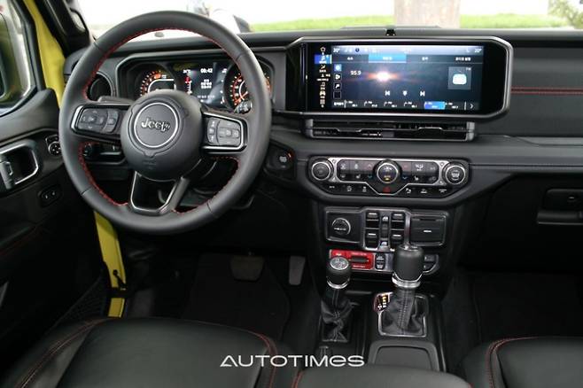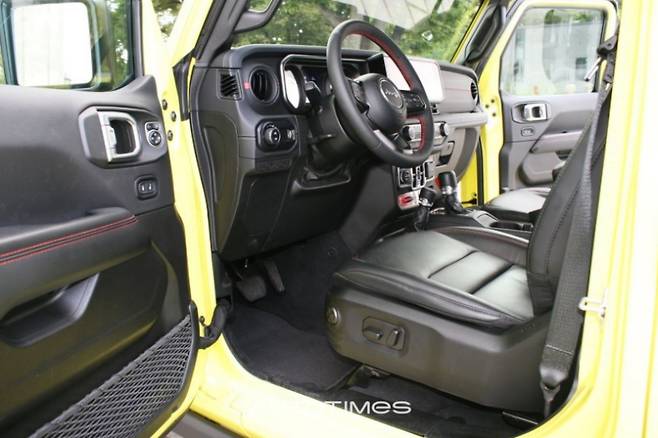 실내는 너무 편해졌다. 그 중에서도 1열의 변화가 가장 눈에 띈다. 자동차 인포테인먼트 시스템의 최신 흐름인 12.3인치의 터치스크린을 적용한 것. 반면, 클러스터와 변속기 레버는 이전과 같다. 주차브레이크는 레버식을 계속 고수한다. 시승차는 루비콘 트림이라 실내 곳곳에 붉은색 스티치가 적용돼 트림간 차이점을 뒀다. 하드탑 실내에는 외부 소음과 열차단을 위한 옵션인 하드탑 헤드라이너까지 넣었다. 다기능 스티어링 휠에는 어댑티브 크루즈 컨터롤이 적용돼 버튼을 추가했다.