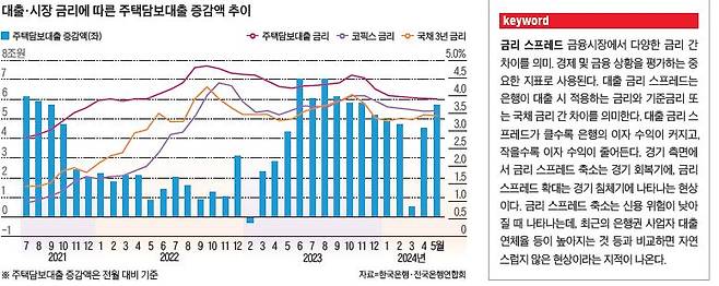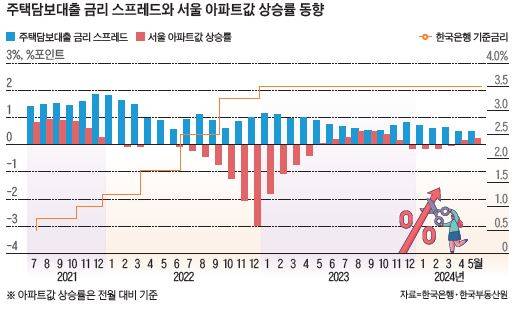 전국 집값 상승을 이끌고 있는 서울 아파트값 상승은 주택담보대출(이하 주담대) 금리 하락이 이끌고 있다. 한은 기준금리가 2023년 1월 이후 19개월 연속 3.50%에 묶여 있지만, 은행권 변동금리형 주담대의 기준으로 쓰이는 코픽스(COFIX·자금 조달 지수) 금리(신규 취급액 기준)는 같은 기간 4.0%에서 3.52%까지 내려왔다. 이에 따라 한은이 집계하는 주담대 가중 평균 금리(신규 취급액 기준)도 4% 후반에서 1%포인트가량 하락해 최근 3.9%대에 진입했다. 이같이 대출 금리가 내려가자, 2021년 8월 기준금리 인상 시작 직후 월평균 1조원 수준으로 둔화한 주담대 증가액은 2023년 하반기부터는 금리 인상 이전인 월평균 5조원대로 늘어났다. 2023년 12월부터 넉 달 연속 하락했던 서울 아파트값이 4월부터 상승세로 돌아섰고, 지난 6월에는 금리 인상발(發) 가격 조정 전 수준을 회복했다. 주목할 지점은 이 같은 서울 아파트값 회복세가 대출 금리 스프레드 축소와 동반됐다는 사실이다. 시장 금리의 지표 역할을 하는 3년 만기 국채 금리와 주담대 금리 간 스프레드(spread·격차)는 기준금리 인상 이전 1.40%포인트대에서 최근에는 통계 집계 이후 역대 최소 수준인 0.4%포인트대로 좁혀졌다. 대출 금리 스프레드 축소는 은행이 자금 조달 금리와 큰 차이가 나지 않는 금리 수준으로 대출 상품을 판매할 때 나타난다. 은행의 대출 마진이 줄어드는 반면, 금융 소비자는 시장 금리에 비해 낮은 비용으로 대출을 받을 수 있다. 장민 금융연구원 선임 연구위원은 “내수 경기 회복이 강하지 않은 상황에서 대출 금리 스프레드가 좁혀지는 것은 대출 금리에 영향을 미치는 경제 외적 영향이 있을 가능성을 시사한다”면서 “이럴 경우은행은 대출 확대 등을 통해 수익성을 회복하려고 한다”고 말했다.