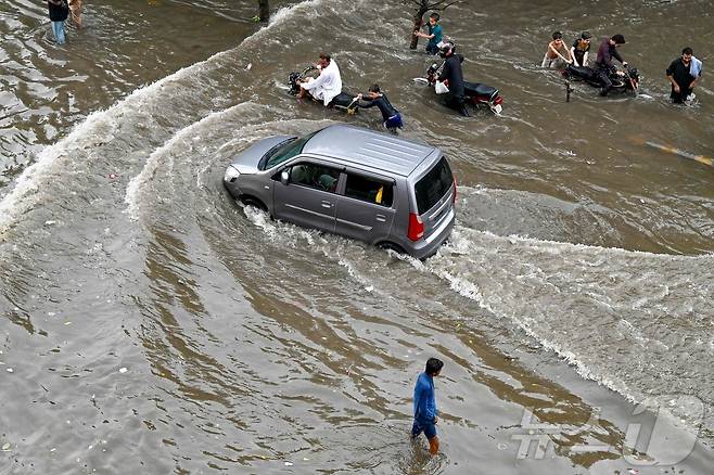 (라호르 AFP=뉴스1) 우동명 기자 = 28일 (현지시간) 폭우가 쏟아진 파키스탄 라호르의 물에 잠긴 도로에서 자동차가 물살을 가르며 지나 가고 있다. 2024.07.29