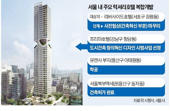 프로젝트파이낸싱(PF) 경색과 공사비 상승 등으로 상당수 개발사업이 멈춰 섰지만 최고급 호텔을 낀 개발 사업은 상대적으로 선전하고 있다. 강남구 청담동 옛 프리마호텔 부지에도 47층짜리 7성급 호텔과 레지던스를 세우는 ‘르피에드 청담’ 개발이 추진되고 있다. 대지 5462㎡의 저층부(2~16층)에 호텔, 고층부(17~47층)에 하이엔드 주거시설(레지던스 오피스텔 등)을 짓는 안이다. 이 사업은 지난해 서울시의 도시건축 창의·혁신 디자인 시범사업 대상으로 선정돼 용적률이 기존 420%에서 600% 내외로 높아져 사업 추진에 파란불이 켜졌다. 시행사인 미래인과 최근 참여를 결정한 신세계프라퍼티가 공동으로 개발을 추진 중이다.
