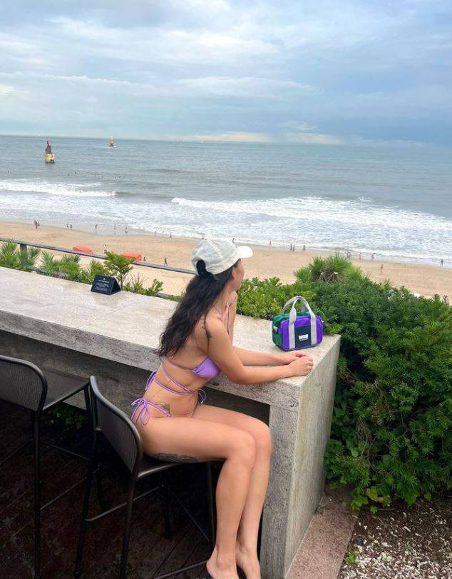 부산 해운대를 배경으로 찍은 사진 속 나다는 보라색 비키니와 흰색 모자로 멋을 냈다. 쇄골과 허벅지에 새겨진 스타일리시한 타투와 남다른 볼륨감이 눈길을 끈다.
