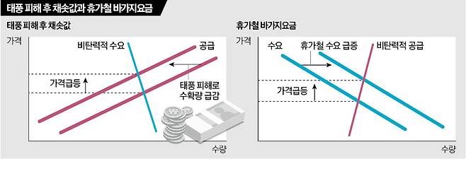 공급은 고정된 상태에서 수요가 급증하니 가격이 당연히 크게 오른다. 태풍이 지나간 다음 채소값이 급등하는 것과 다를 바가 없다. 차이가 있다면 풍수해 이후 채소값 상승은 공급 충격으로 인한 것이고, 피서지 바가지요금은 수요 급증에 따른 것이라는 점뿐이다.