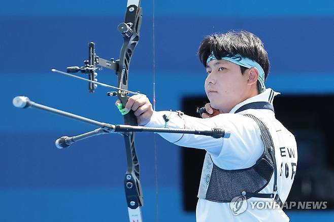 (파리=연합뉴스) 김인철 기자 = 29일(현지시간) 프랑스 파리 레쟁발리드 양궁 경기장에서 열린 2024 파리올림픽 양궁 남자 단체 8강전 한국과 일본의 경기. 이우석이 활시위를 당기고 있다. 2024.7.29