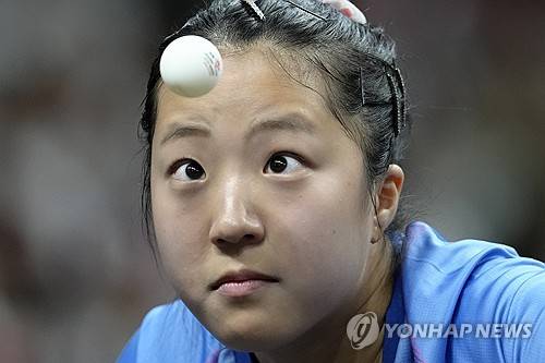 South Korea's Shin Yubin watches the ball during a mixed doubles semifinal table tennis game against China's Wang Chuqin and Sun Yingsha, at the 2024 Summer Olympics, Monday, July 29, 2024, in Paris, France. (AP Photo/Petros Giannakouris)