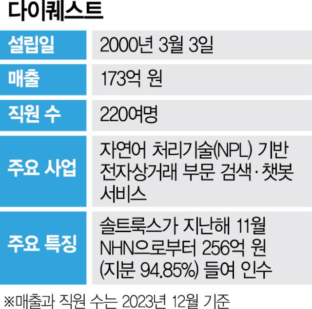 다이퀘스트는 자연어 처리기술(NLP)을 기반으로 한 전자상거래 부문 검색·챗봇 서비스 국내 1위 기업이다. 기존 ‘NHN(181710) 다이퀘스트’로 NHN 산하에 있었으나 지난해 11월 솔트룩스가 256억 원을 들여 지분 94.95%를 인수했다.