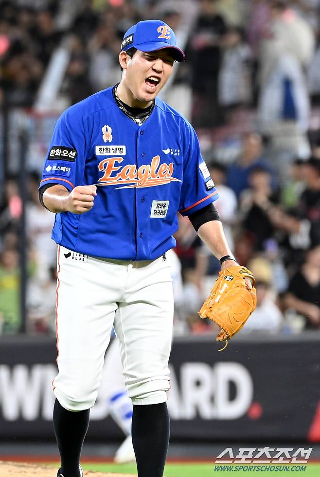 30일 수원KT위즈파크에서 열린 한화와 KT의 경기, 6회말 2사 2루 한화 박상원이 KT 황재균을 우익수 플라이로 처리한 후 환호하고 있다. 수원=허상욱 기자 wook@sportschosun.com/2024.07.30/