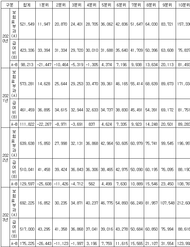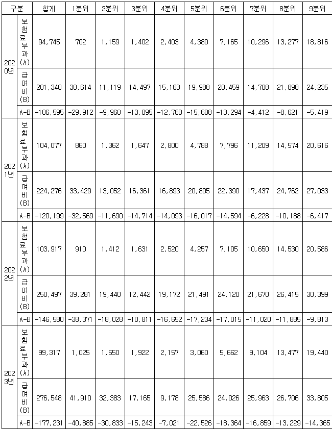 지역가입자를 10분위 소득수준별로 세분화해서 들여다보면, 가장 소득이 높은 10분위만 빼고, 나머지 1∼9분위 9개 소득 구간에 걸쳐 모두 부담한 보험료보다 더 많은 요양 급여비를 받았다.