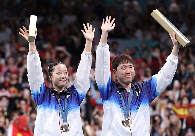 | ▲ 30일(현지시간) 프랑스 파리 사우스 파리 아레나4에서 열린 2024 파리올림픽 탁구 혼합복식 시상식에서 동메달을 차지한 한국 임종훈·신유빈이 인사하고 있다. |