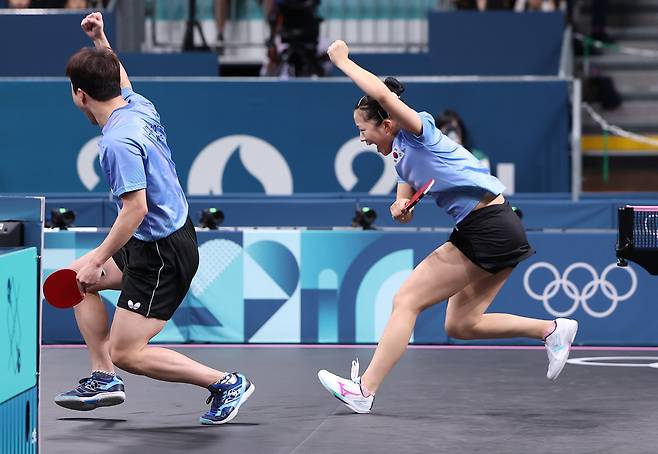 | ▲ 30일(현지시간) 프랑스 파리 사우스 파리 아레나4에서 열린 2024 파리올림픽 탁구 혼합복식 동메달 결정전에서 한국 임종훈-신유빈이 득점에 성공한 뒤 환호하고 있다. |