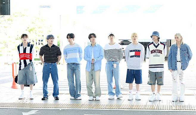 스트레이키즈가 출국 전 포즈를 취하고 있다.