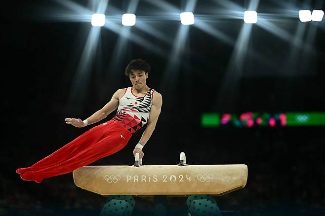 | ▲ 2024 파리 올림픽에 참가한 일본의 신노스케 오카가 예선 경기에서 안마 연기를 하고 있다. 2024.7.27 |