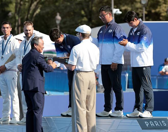 | ▲ 29일(현지시간) 프랑스 파리 레쟁발리드 양궁 경기장에서 열린 2024 파리올림픽 양궁 남자 단체전 시상식에서 이기흥 대한체육회장이 우승을 차지한 한국 대표팀 선수들에게 금메달을 수여하고 있다. 2024.7.30 |