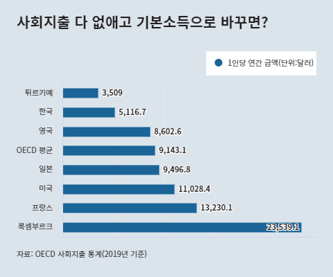 모든 국민을 대상으로 기본소득을 제공하는 데 어마어마한 돈이 들 건 뻔하죠. 만약 세금을 더 거두지 않고, 지금 예산 한도 내에서 전 국민 기본소득을 실시한다면 과연 1인당 최대 얼마나 돌아갈 수 있을까요. 다소 극단적인 가정을 가지고 계산해 봤습니다. 중앙정부와 지방정부, 공기업 등이 제공하는 모든 사회지출(현금·현물·세금감면을 통한 지출, 건강 관련은 제외)을 다 없애고 그 예산을 모조리 기본소득 지급에 사용하는 경우이죠. 그 수치는 OECD가 집계한 국민 1인당 연간 사회지출 금액(2019년)을 보면 쉽게 확인할 수 있습니다. 그래서 결과는.