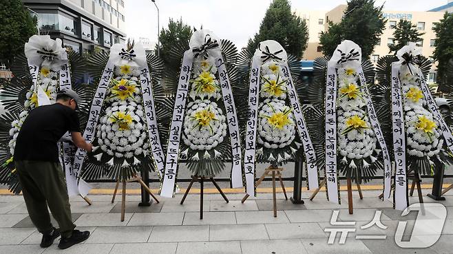 (서울=뉴스1) 박세연 기자 = 31일 서울 용산구 하이브 사옥 앞에 뉴진스 팬들이 보낸 근조화환이 놓이고 있다. 2024.7.31/뉴스1