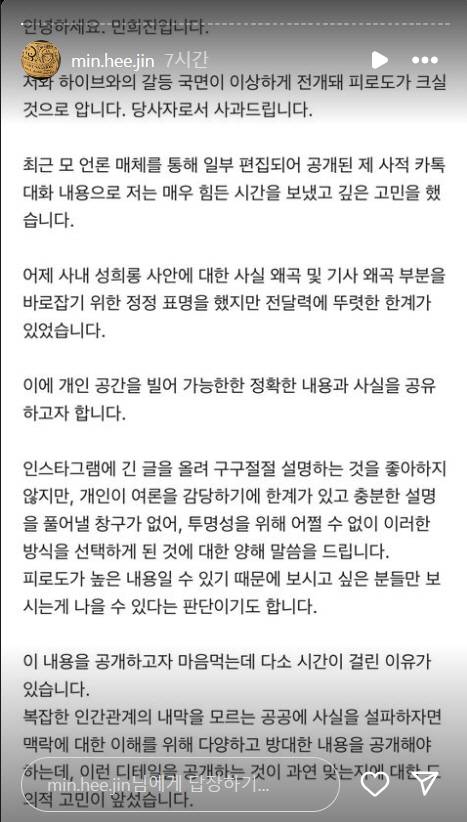 민 대표는 "어도어 자체 조사도 아닌 하이브 조사와 결론 통보로 이미 마무리 된 사안을 자신들의 결정에도 불구하고 사실과 다르게 왜곡된 시각으로 엉뚱한 시점에 수면 위로 올린 저의가 무엇인지 예상되는 부분이 있고 저뿐 아니라 관련 구성원들 및 파트너사 등이 실제로 또 다른 2차 피해를 당하고 있기에 더 늦지 않게 사실을 바로 잡아야 한다는 생각이 들었습니다"라고 밝혔다.