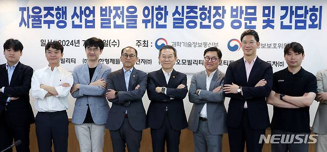 왼쪽부터 이상민 뉴빌리티 대표, 김주현 우아한형제들 정책실장, 서한별 LG전자 상무, 고학수 개인정보보호위원회 위원장, 이 장관, 신승규 현대자동차 전무, 장성욱 카카오모빌리티 부사장, 정성균 포티투닷 상무. 2024.07.31. scchoo@newsis.com
