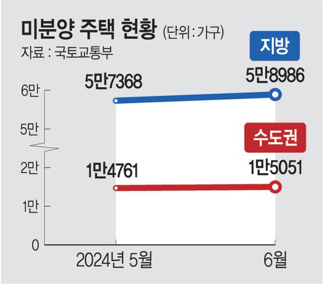 국토교통부가 31일 발표한 ‘2024년 6월 주택통계’를 보면, 올해 6월 전국 미분양 주택은 7만4037가구로 집계됐다. 5월보다 2.6%(1908가구) 늘며 7개월 연속 증가했다. 지방 미분양 물량은 5만8986가구로 한 달 새 2.8%(1618가구) 늘었다. 수도권(서울 포함) 미분양도 1만5051가구로 2.0%(290가구) 증가했다. 6월 말 기준 경기 미분양은 9956가구로 대구(9738가구)를 제치고 전국에서 미분양이 가장 많은 지역이 됐다. 2017년 6월(1만1229가구) 이후 7년 만에 최대치다.