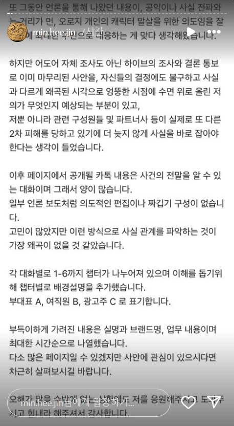 또 "점점더 본질과 멀어지는 괴상한 싸움으로 변질되는 것이 기이합니다. 하이브와 일부 매체들은 인권에 대한 개념을 상기하시고 상식으로 돌아가 유례없는 개인에 대한 무분별하고 무자비한 비방을 멈추기 바랍니다. 최소한의 양심도 없이 불법 유출 자료를 편집해 이용하는, 수준 이하의 이간질을 비롯해 더이상의 비상식적인 공격에 대응할 여력도 마음도 없습니다만 제가 포기가 안되는 이유는 이런 일은 누구도 당해서는 안되는 일이기 때문입니다"라고 전했다.