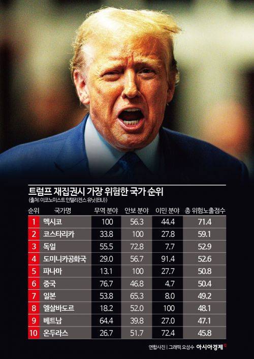 이코노미스트가 운영하는 이코노미스트 인텔리전스 유닛(EIU)은 30일(현지시간) 미국의 70개 상대 상대국을 대상으로 트럼프가 재집권할 경우 무역, 안보, 이민 분야 영향을 분석한 '트럼프 위험지수(Trump Risk Index)'를 공개했다. 무역과 안보에 각각 40%, 이민 분야에 20%의 비중을 두고 총 위험 노출 점수를 계산했다.