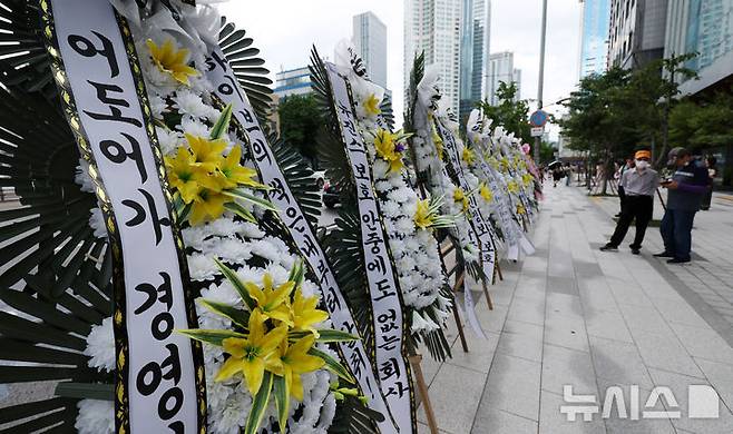 뉴진스 팬들은 하이브 사옥 앞에서 뉴진스 소속사 어도어 및 민희진 대표를 지지하는 트럭 시위를 벌여 왔으며 이날 근조화환 설치를 하는 등 시위를 이어갔다. 2024.07.31. scchoo@newsis.com