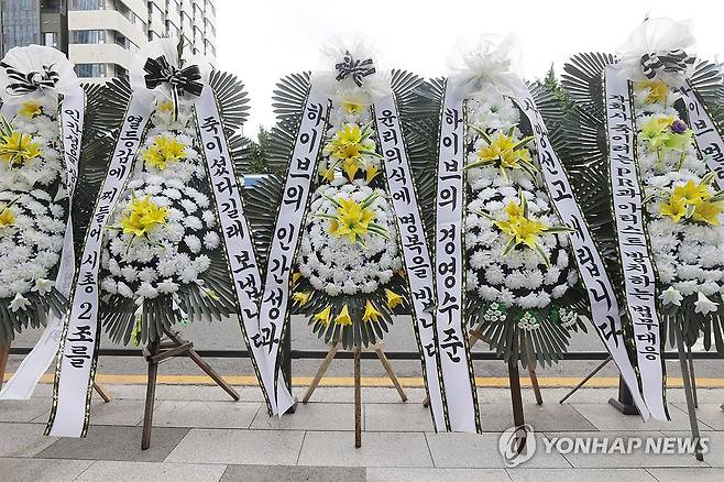 (서울=연합뉴스) 강민지 기자 = 31일 오전 서울 용산구 하이브 사옥 앞에 뉴진스 팬들이 보낸 근조화환이 놓여 있다. 2024.7.31