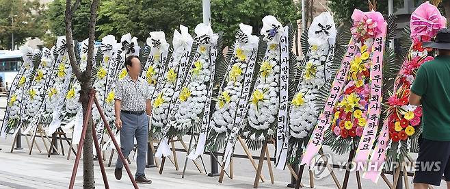 (서울=연합뉴스) 강민지 기자 = 31일 오전 서울 용산구 하이브 사옥 앞에 뉴진스 팬들이 보낸 근조화환이 놓여 있다. 2024.7.31