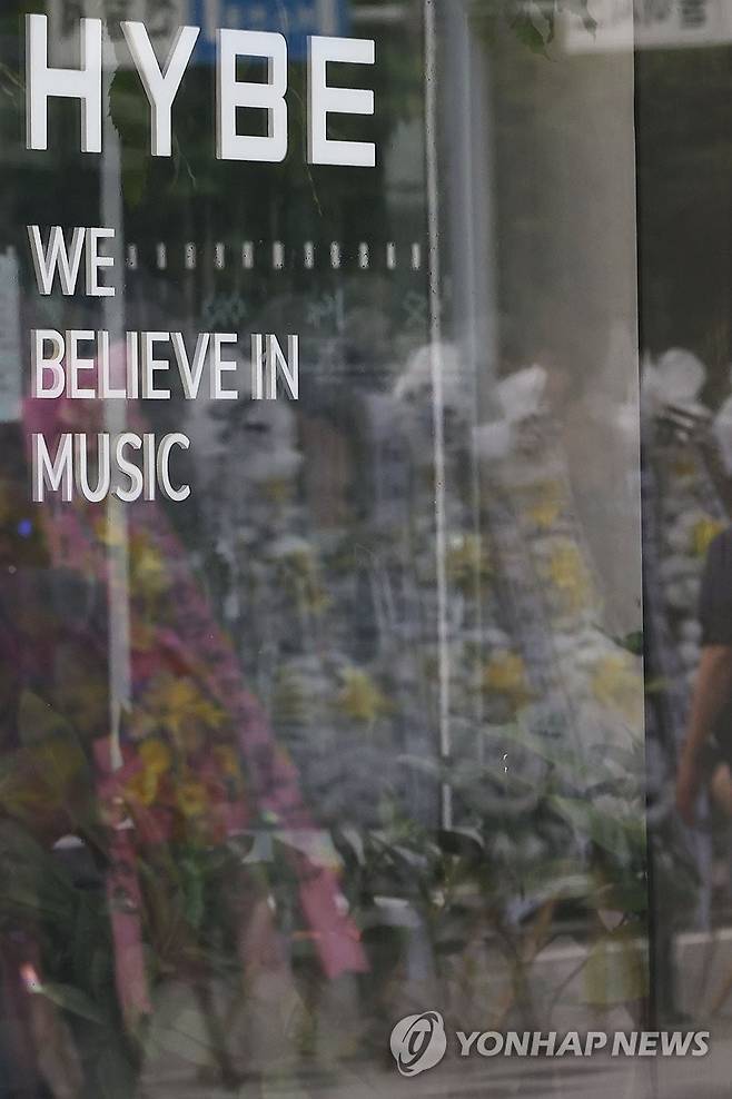 (서울=연합뉴스) 강민지 기자 = 31일 오전 서울 용산구 하이브 사옥에 뉴진스 팬들이 보낸 근조화환이 유리벽에 비쳐 보이고 있다. 2024.7.31