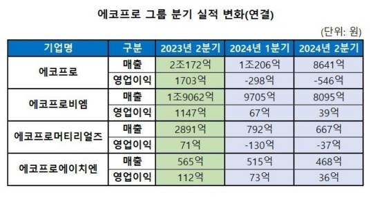 에코프로그룹의 양극재 자회사 에코프로비엠은 지난 2분기 매출액 8,095억 원, 영업이익 39억 원을 기록했다. 전년 동기 대비 각각 57.5%, 96.6% 감소한 수치다.