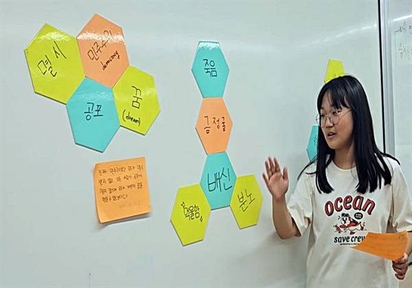 | ▲ 홍동중학교 2학년 학생들은 6.25 전쟁 74주년을 맞아 지난 학기 내내 '반전'과 '평화'를 위한 프로젝트수업을 했다. 책한 학생이 모둠별문장만들기 수업시간에 발표를 하고 있다. 을 읽고 떠오른 단어 1개씩을 적어 모둠원 4명이 이 단어를 모두 넣어 연결해 문장을 만드는 방식이다. |