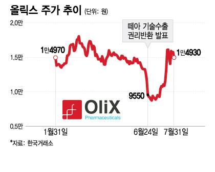 RNA 간섭기술을 기반으로 한 신약 플랫폼을 기반으로 다수 신약 후보를 보유한 올릭스의 기업가치는 최근 크게 출렁였다. 회사의 주요 기술수출 성과로 꼽혀온 습성 황반변성 치료제 후보 'OLX301'과 습성 황반변성·망막하섬유화증 치료제 후보 'OLX301D'의 권리가 지난달 24일 반환된 탓이다.