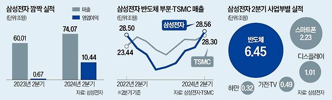 삼성전자의 ‘아픈 손가락’이었던 고대역폭메모리(HBM) 사업이 정상궤도에 들어서고 있다. 지난 2분기 전체 HBM 매출이 전 분기 대비 50% 이상 증가한 데다 최신 제품인 HBM3E 생산도 임박해서다. 인공지능(AI) 시대를 맞아 몸값이 천정부지로 뛴 HBM 사업이 정상화하는 것은 반도체 왕좌를 되찾는 ‘마지막 퍼즐’을 맞춘다는 뜻이다. 일반 D램 가격도 큰 폭으로 오른 만큼 올해와 내년 실적이 ‘반도체 슈퍼사이클’이 온 2018년 3분기(영업이익 17조5700억원)에 근접할 것이란 전망이 나온다.