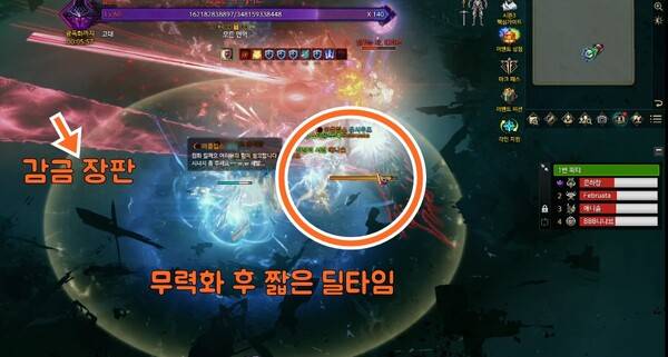 무력화 기믹 진행 중 정면으로 뿌리는 레이저 장판에 맞으면 감금에 걸린다. 보이는 것보다 판정이 꽤 넓으며, 레이저 장판을 회피하다 외곽으로 넘어가 반대 방향에서 장판에 맞는 경우도 있다. 그것만 주의한다면 어렵지 않은 기믹이다.
