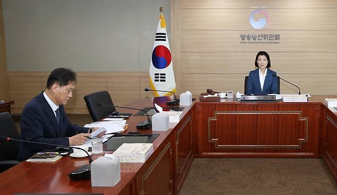 | ▲ 이진숙 신임 방통위 위원장, 회의 진행 이진숙 신임 방송통신위원장이 31일 오후 경기도 과천정부청사 내 방송통신위원회에서 김태규 신임 상임위원이 참석한 가운데 2024년 제34차 회의를 진행하고 있다. 이번 회의는 한국방송공사 이사 추천 및 방송문화진흥회 이사 임명 관련 후보자 선정에 관한 건, 한국방송공사 이사 추천 및 방송문화진흥회 임원 임명에 관한 건 등 4건의 의결사항이 비공개로 진행됐다. |