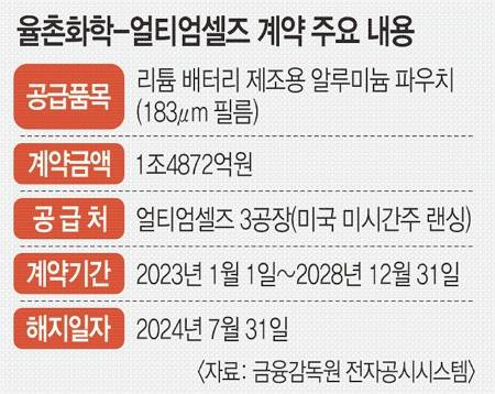 율촌화학은 31일 얼티엄셀즈가 1조4871억원 규모의 리튬배터리 제조용 알루미늄 파우치 공급 계약 해지를 통보했다고 공시했다. 얼티엄셀즈 측은 계약 해지 이유로 미국 미시간주 랜싱에 짓고 있던 3공장 건설을 일시 중단했다는 점을 들었다.