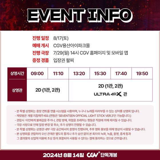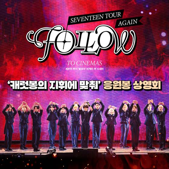 '세븐틴 투어 '팔로우' 어게인 투 시네마' 개봉 주 주말인 17일 CGV용산아이파크몰에서는 '캐럿봉의 지휘에 맞춰' 응원봉 상영회가 예정된 가운데, 해당 상영회는 예매 오픈과 동시에 ULTRA 4DX 상영관 전석 매진을 기록해 캐럿(팬덤)들의 뜨거운 관심을 확인 시켰다.